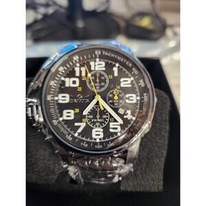 Invicta men's watch featuring a black dial with white and yellow accents.