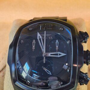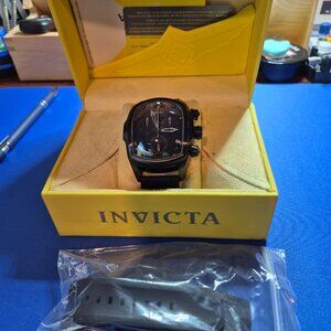 Invicta Lupah chronograph watch, model 6724. 46.8mm black case with black dial and white hands. Swiss quartz movement with new battery. Original silicone strap had dried out and cracked. Watch comes with a new black silicone strap and comes in original box with papers. Watch is unworn and in excellent condition. GB22