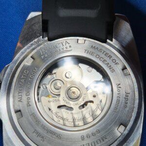 Invicta model 6998 dive watch. Master of the Ocean series. 45mm stainless case with black silicone strap. Mother of pearl dial with black fixed bezel. NH 25A automatic movement. Watch is unworn and comes in original box with papers. GB21