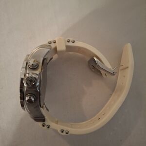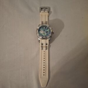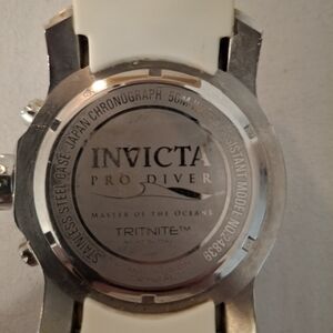 Invicta Men's Pro Diver Scuba Master of the Ocean watch with abalone face. Dial 50 mm. Stainless steel case. Japan Chronograph Quartz movement. White polyurethane band with stainless steel inserts. Model # 24839. Trinite night glow with flame-fusion crystal and push crown. Water resistant up to 50 m/ 165 feet, suitable for short periods of recreational swimming, but not diving or snorkeling. Just serviced with brand new battery. Perfect working condition. Larger watch at 50 mm. Band length 8-1/2 inches and 1 inch wide