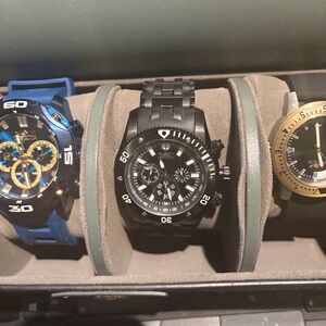 Five Invicta watches in a sleek case. Features gold, blue, black, and silver designs.