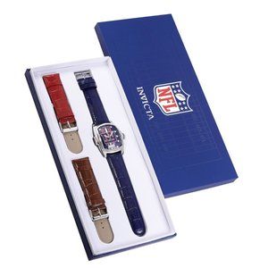 This 47mm Invicta NFL watch features a precise Quartz movement as well as a steel case. Its metal dial is enclosed by a highly protective Flame Fusion Crystal. This watch is finished by a strong dark blue leather band, and it offers 100 m water resistance.