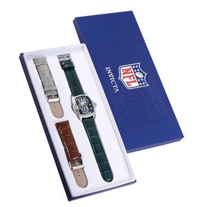 This 47mm Invicta NFL watch features a precise Quartz movement as well as a steel case. Its metal dial is enclosed by a highly protective Flame Fusion Crystal. This watch is finished by a Green leather band, and it offers 100 m water resistance.