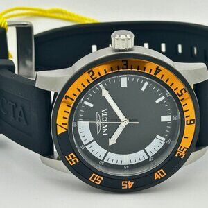 Acclaimed for unique designs stellar movements and superior craftsmanship Invicta Specialty inhabits the cusp of horology where creative minds turn complications into challenges and make history one masterpiece at a time. Silver-tone stainless steel case with a blue silicone strap. Fixed black and orange stainless steel bezel. Black dial with silver-tone hands and index hour markers. Minute markers around the outer rim.