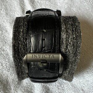 Invicta 0413 Pro Diver Sea Hunter chronograph men's dive watch features a 58mm wide and 18mm thick gunmetal ion plated solid stainless steel case with a unidirectional rotating coin edged bezel and a textured screw down crown with function pushers. Invicta 0413 is powered by an accurate Swiss Ronda 8040.N quartz chronograph movement. This stylish watch also features a gunmetal carbon fiber dial with white accents gunmetal luminous hands and Arabic numeral hour markers along with the chronograph, retrograde day and big date display function, scratch resistant flame fusion crystal and water resistant to 300 meters. Invicta 0413 is equipped with a 30mm wide black leather strap with a buckle clasp. Invicta 0413 men's Pro Diver Sea Hunter gunmetal IP steel leather strap chronograph dive watch