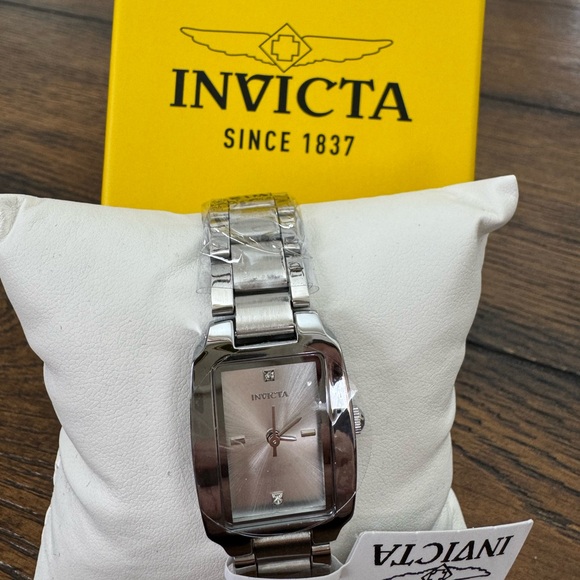 Stylish Invicta watch with a rectangular face. Silver metallic finish and elegant design. Brand new in box with tags and original packaging