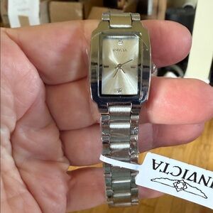 Sleek Invicta watch with a rectangular face. Shiny metal bracelet.