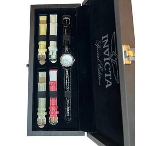 Invicta Special Edition watch set, working at time of photo (push side button in to start). Interchangeable straps in black, white, pinkish red, yellow and sage green. comes with wood box (box has some scuffing). Approx 1.2" watch face circumference. face has heart inlay on iridescent face.