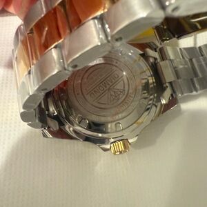 Stylish Invicta watch with a striking black face. Features a gold and silver bracelet. Ideal for any event.