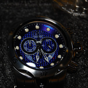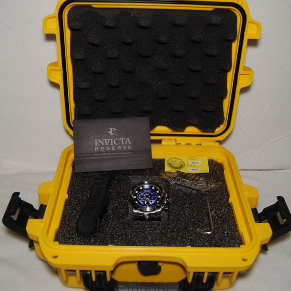 New out of production 53mm Swiss Made Venom Watch Set. Blue Carbon Fiber. Sized to 7.5" Wrist. Includes 1.5" of extra links. Includes extra rubber strap and a changing wrench plus extra pins in a dive storage case.
