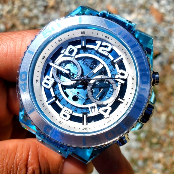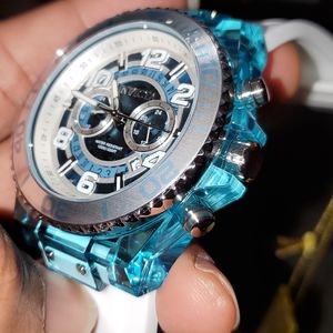 New with Tags Invicta watch:48mm teal blue translucent case.White soft silicone strap;semi transparent dial;water resistant;chronograph movement.Screw down case....Absolutely beautiful watch;