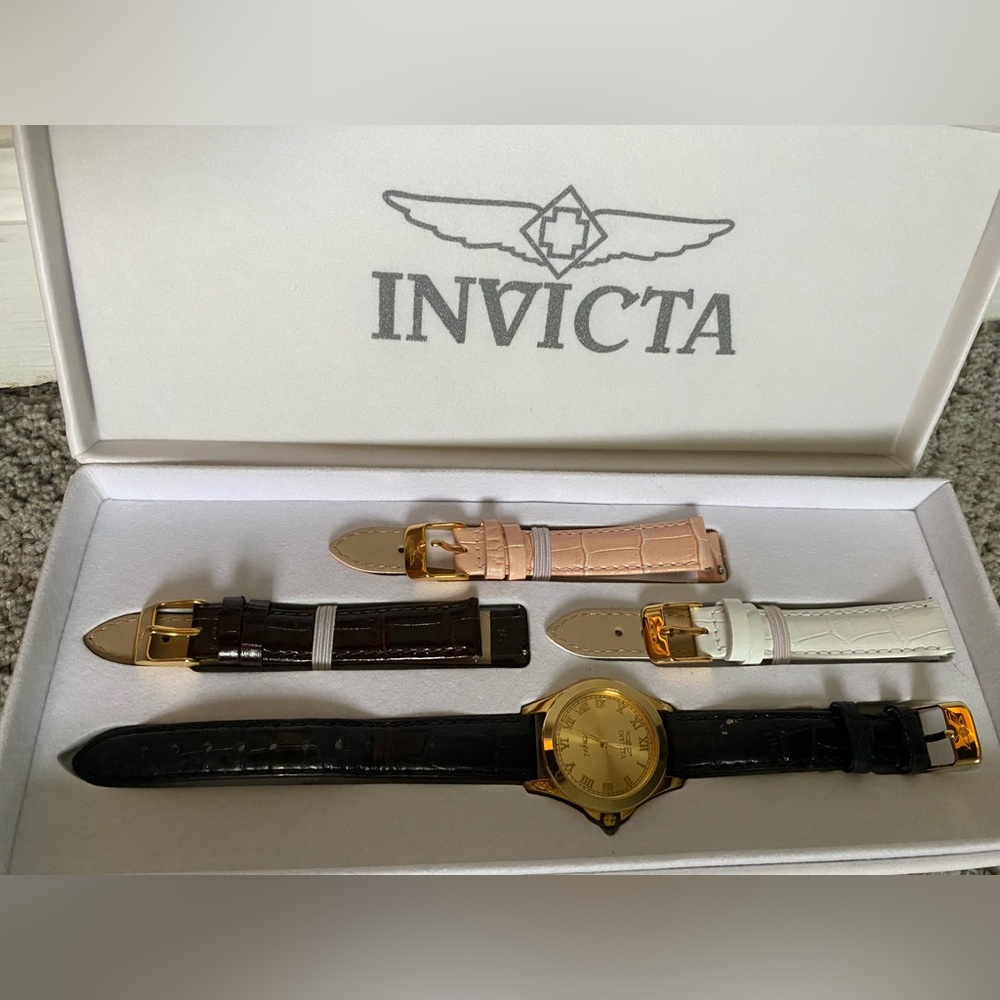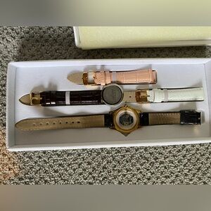 Interchangeable straps. Only black has ever been worn. Wear is shown in pictures. Other straps are brand new. Needs battery.