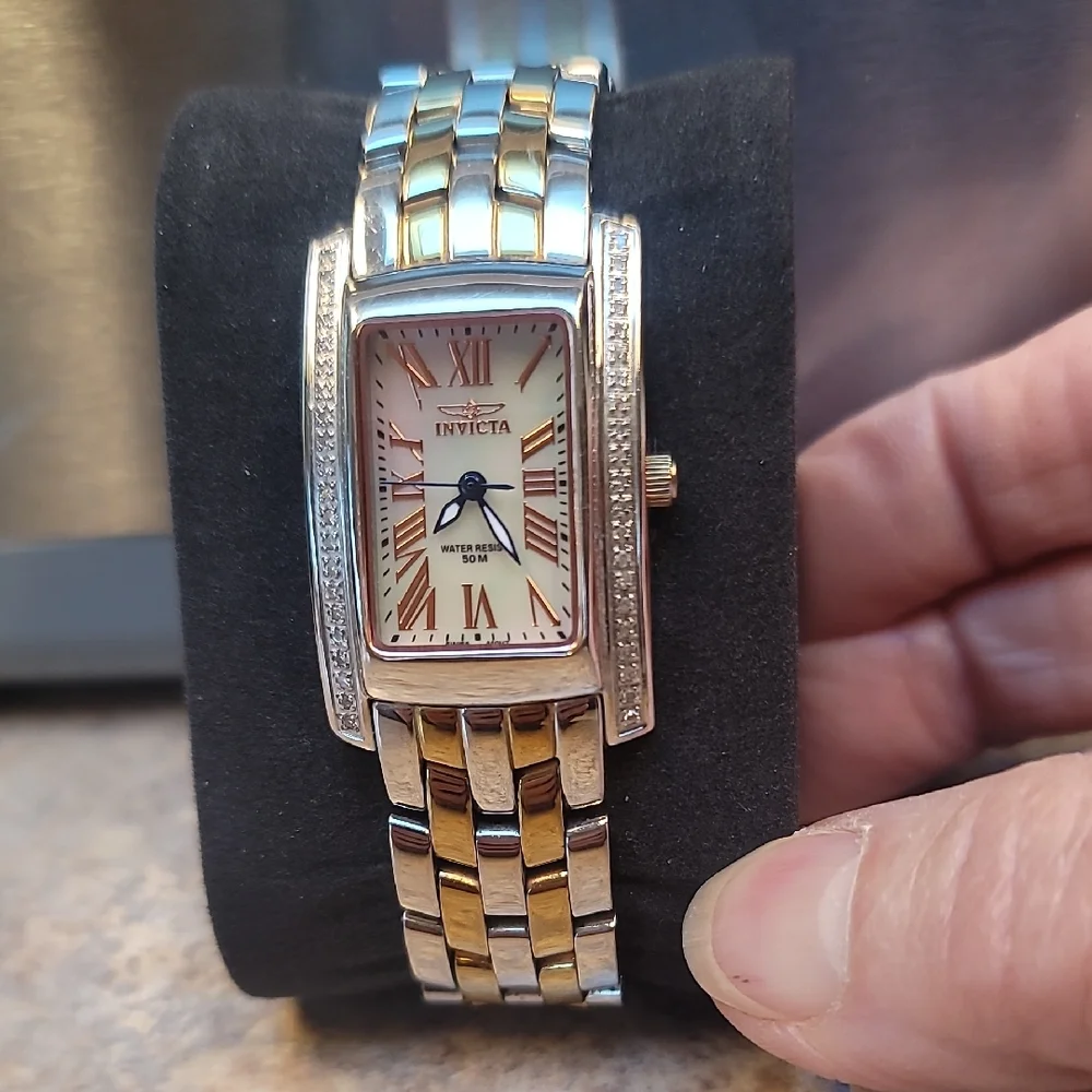 Women's Invicta Watch. Two-tone gold and silver. Has small, normal wear and tear micro scratches on it. Has a double clasp and fits a 7-in wrist above wristbone. This watch does need a battery, but runs perfect with a battery.