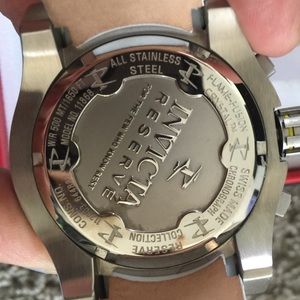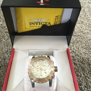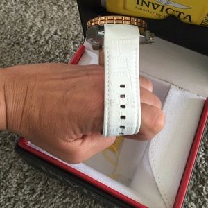 One of a kind men's Invicta watch. has silver and rose gold accents. GORGEOUS watch! Gently worn no scratches on face. Minor wear on the strap from where the buckle covered it. very subtle. Overall, I would rate this watch a 9/10!!! Comes with everything it came with!