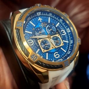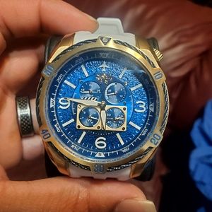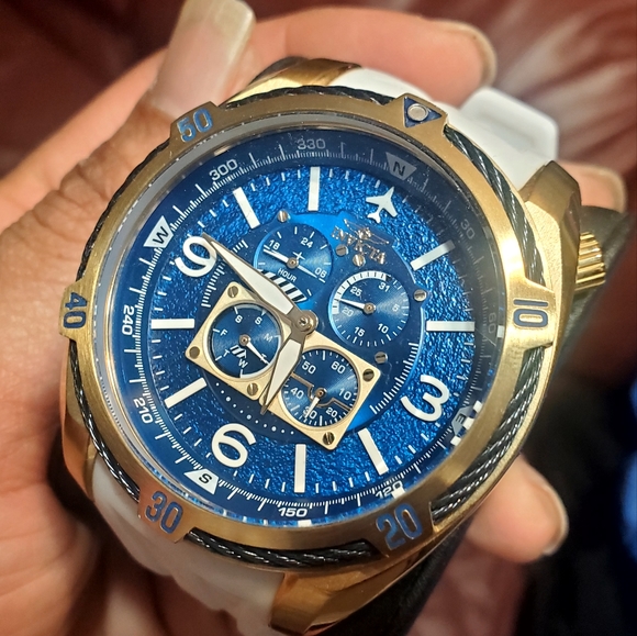 50mm Invicta Aviator!Great conditioned;blue textured dial;gold-tine case;white comfy silicone strap;chronograph movement.Needs battery.