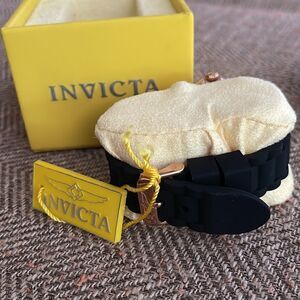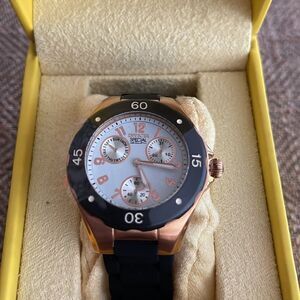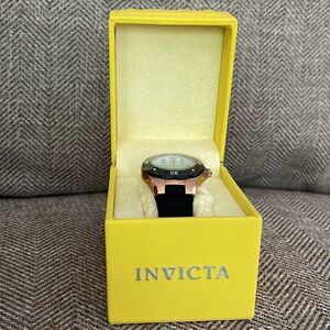 This Invicta watch is beautiful. It has a rose gold face with black trim and a black flexible band. It is water resistant and has many loop holes for the perfect fit. The face is 1.5” across and the wrist is 6.25” on the second loosest notch.