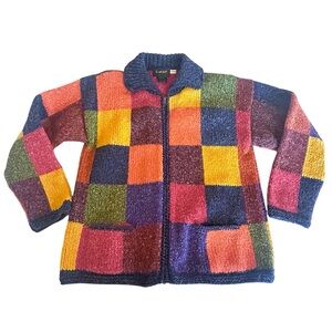 Invisible World Juneau Alaska Handknit Rainbow Patchwork Cotton Wool Zip Sweater
