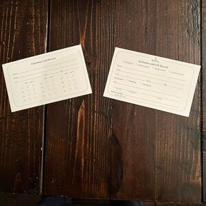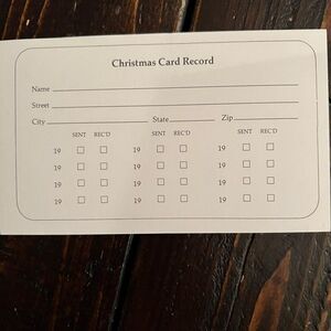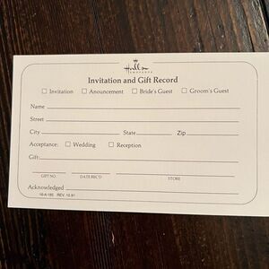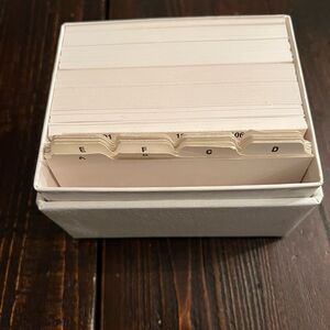 This item is an Invitation/Gift/Christmas Card Record Box. This elegant white box contains cards to record these items with an alphabet cards to file them. This item is from the great department store Halls in Kansas City. The box is 5 1/2” x 4” x 4 1/2”. The box is in excellent condition. There is a pen mark on one side.
