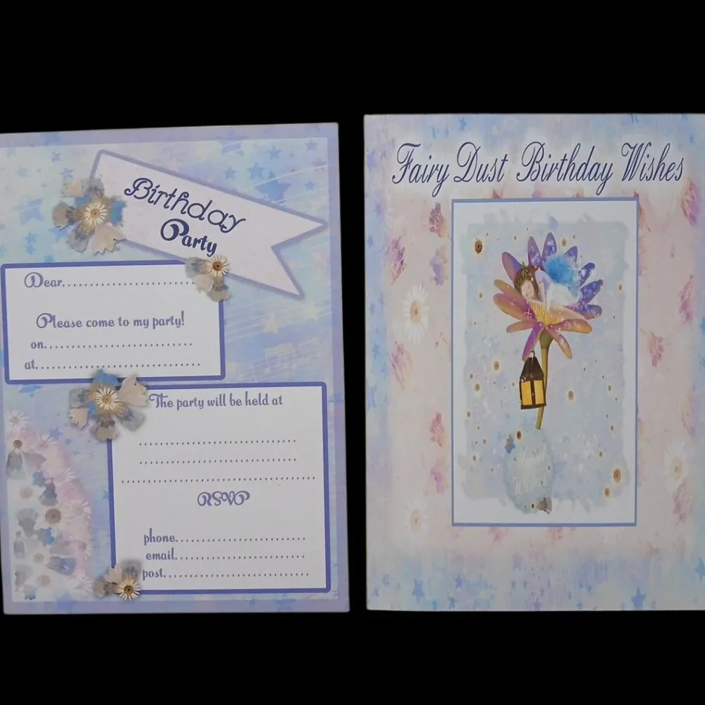 15- 5x7 Birthday invitations with envelopes and one matching birthday card. Done here in our home workshop.