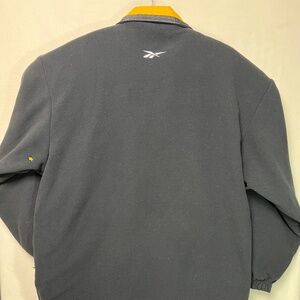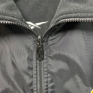 The Fleece side of the jacket is solid black and features a small Hawk logo on the upper left chest, as well as a white Reebok logo on the right chest. The windbreaker side is basically all black with gold center stripe also with small Hawk logo on the upper left chest. Both sides have a small embroidered Rebook logo.