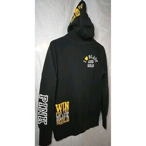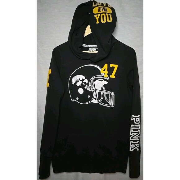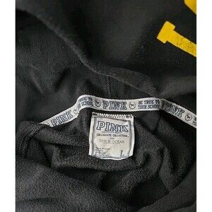 The Iowa Hawkeyes Pink Victoria's Secret Hoodie Sweatshirt is a stylish and comfortable activewear piece featuring a solid black color with embroidered accents and logos. Made from a blend of polyester and cotton, this pullover hoodie has long sleeves, a regular fit, and a hood for added warmth in the winter, fall, and spring seasons. Perfect for activities like gym training, walking, and football, this hoodie is machine washable for easy care and features a Victoria's Secret PINK product line design, making it a must-have for fans of the University and College themes.
