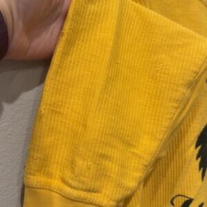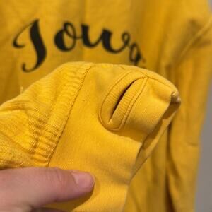 Iowa yellow sweatshirt with Iowa Hawks graphic. Perfect for any Hawkeye fan! Super comfy, sleeves have thumbholes. Back of one sleeve does have a few small snags shown. Soft and cool inside out style: