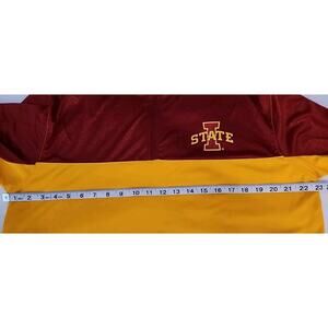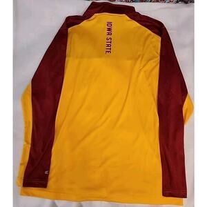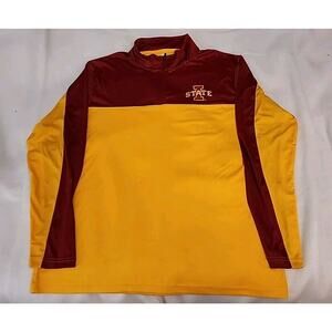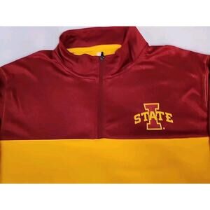 Iowa State Cyclones women's large red quarter zip pullover. This Colosseum brand jacket is 100% polyester. The pullover style features a 1/4 zip closure and is designed with a vibrant red color and the Iowa State Cyclones logo.