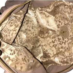 Darling plump satchel in blush/earthy pink with silver leather detail and cute buttons on the pockets for extra style. Very cute and spacious. 15x13x5. Quite roomy and very nice. Has beautiful Ipanema brocade lining with more pockets inside. Order it today. You will love it 😍.