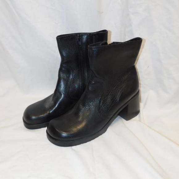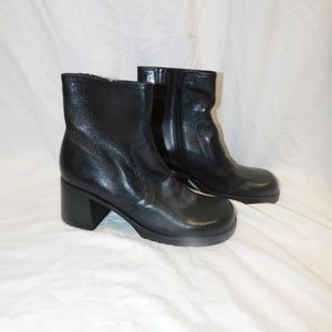 A pair of faux leather heeled booties, closed-toed with zipper enclosure.