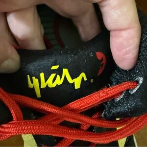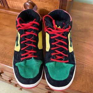 Vibrant high-top sneakers featuring a bold design. Black base with green and yellow accents. Red laces add a striking contrast. Very stylish for skateboarding or any casual occasion. Shoes are gently loved and are showing some wear spots on the black suede as well as the lettering. Please see pictures for details.