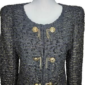 Wool blend black tweed jacket with silver and gold sparkle threads throughout.