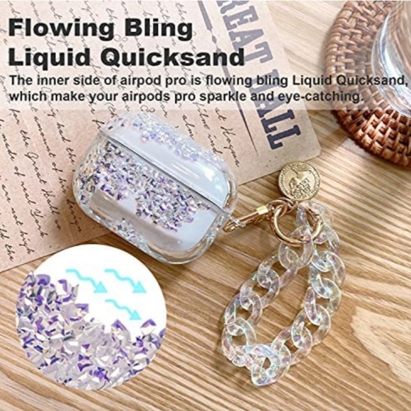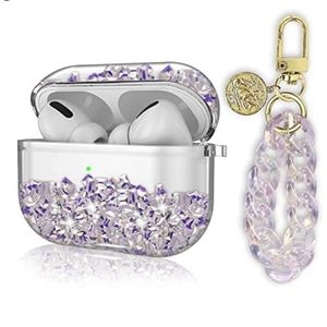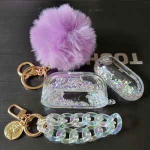 NWOT, Compatible Apple Airpods Pro Case Cover, Clear Glitter Case Bling Liquid Quciksand Hard Shell Protective Cover with Keychain Lanyard Designed for Apple AirPods Pro Charging Case, Clear iridescent & lavendar pom pom. Interchangeable or wear them together! sooo cute 😍 Both keychain & pom pom on GOLD chains. LIKE NEW
