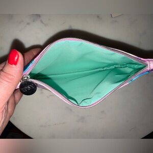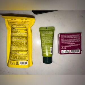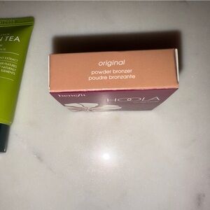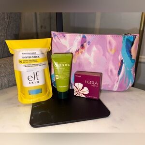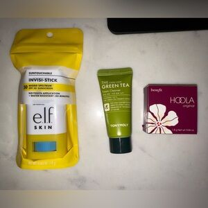 Includes ipsy pink and blue pouch, e.l.f. sunscreen, TonyMoly green tea cleanser, and Benefit Hoola bronzer.