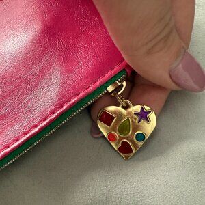 Ipsy, never been used, bright pink on one side and gorgeous blue on the other, cute colorful rhinestone heart charm charm, faux leather, scratches on the fake leather from transport
