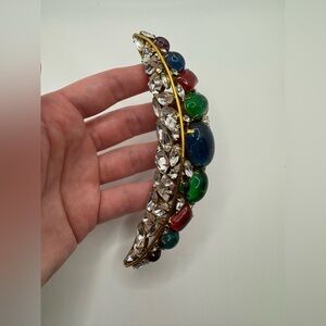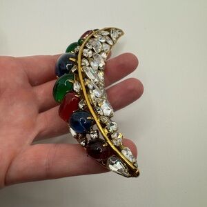 Vintage circa 1980s Iradj Moini for Oscar de la Renta couture Moghul inspired gold tone green red blue Gripoix glass cabochon pin brooch 5.5” long. Collector item!