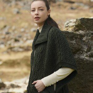 Ireland Aran Crafts 100% Merino Wool Cable Knit Cardigan Poncho Sweater Jacket Small/Medium Army Green