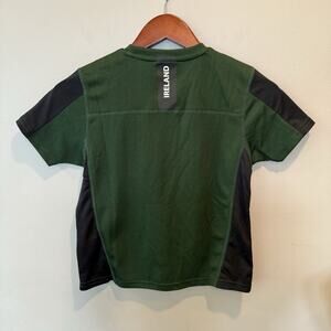 Description: youth jersey made with performance material that aids breathability and is sweat-wicking; predominantly green with black; features 4 provinces of Ireland crest