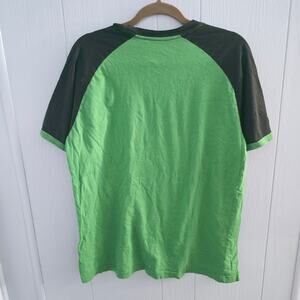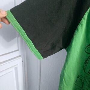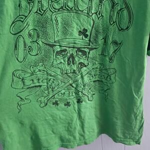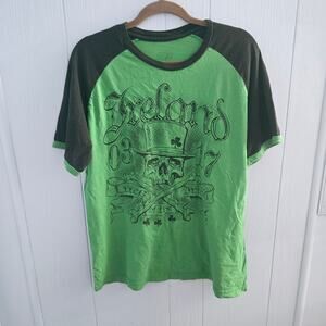Green and black raglan-style tee with a bold “Ireland 03.17” front graphic featuring a leprechaun skull, crossed bones, shamrocks, and gothic lettering. Size XL. Tag print is faded, but shirt still fits true to size. Super soft, broken-in feel.