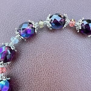 Iridescent AB Glass Beaded Bracelet Silver Ankh Charm Toggle Clasp Purple Aurora