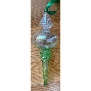 This Iridescent Art Glass Finial Ornament is a vintage blown glass ribbed ornament measuring 8 inches in height. The green color and decorative ribbed pattern add a touch of holiday charm. Handmade and original, this ornament is perfect for collectors looking for a unique and decorative addition to their Christmas decor. With a medium size and weight of 3 ounces, this finial ornament is sure to be a standout piece in any holiday ornament collection. Thank you for viewing. (ChrOrn51005251PM).