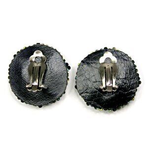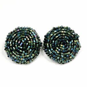 Unmarked costume earrings featuring a circular arrangement of iridescent blue beads hand-set onto a faux leather backing. Clip-on style with moderate weight and a soft backing for comfort. Approx. 1¼" diameter.
