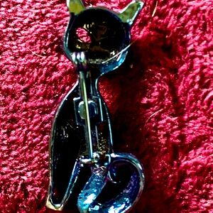 This vibrant iridescent purples, greens, blues cat brooch features a stunning array of colors is 1 3/4” x 3/4” In size.