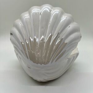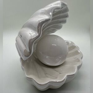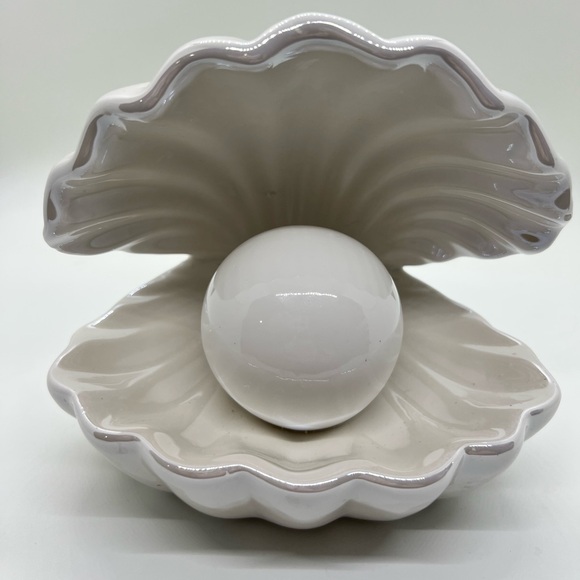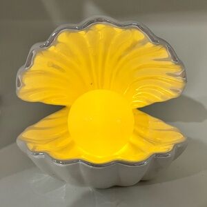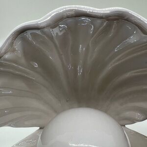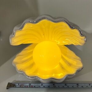 Beautiful, slightly iridescent finish on the shell. Adds a touch of elegance to any space. The light is warm and soft, not as yellow as it appears in the photos. As you can see there is one blemish that occurred during the firing process, located behind the pearl, on the top inside of the shell. Battery-operated. I’m an experienced shipper of fragile things, and this will be well-packed. Clean and smoke free.