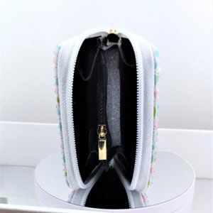 Iridescent clear acrylic bling hearts and dots women's wallet. White with gold tone zipper handle. Faux leather.