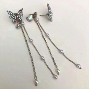 Iridescent Crystal & Pearl Tassel Butterfly Gemstone Earrings NWT