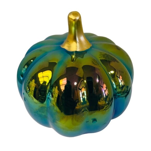 Iridescent Decorative Glass Pumpkin 5" Tall Gold Stem Home Decor Fall Halloween
