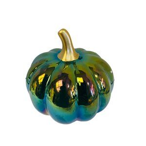 Enhance your seasonal decor with this stunning iridescent glass pumpkin, featuring a shimmering gold stem. Ideal for adding a touch of elegance to any setting.