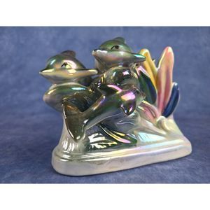Iridescent Dolphin Family With Rainbow Splashing Waves Ceramic Figurine.