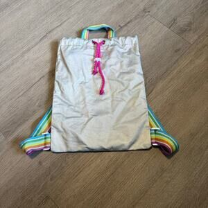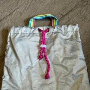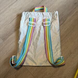 Silver iridescent drawstring backpack with vibrant rainbow straps. This eye-catching bag features a hot pink interior lining and a bright pink drawstring cord with white plastic adjusters. Made with all man-made materials in Cambodia, it's perfect for casual use, gym, or a playful accessory. Excellent pre-owned condition, no visible flaws.