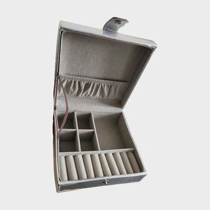 Portable Small Travel Size, Grey Velvet Lining, Compartments for Earrings, Rings, and Other Accessories, Snap Button Closure Tab. PU Exterior. 6.25x6.5x3in.